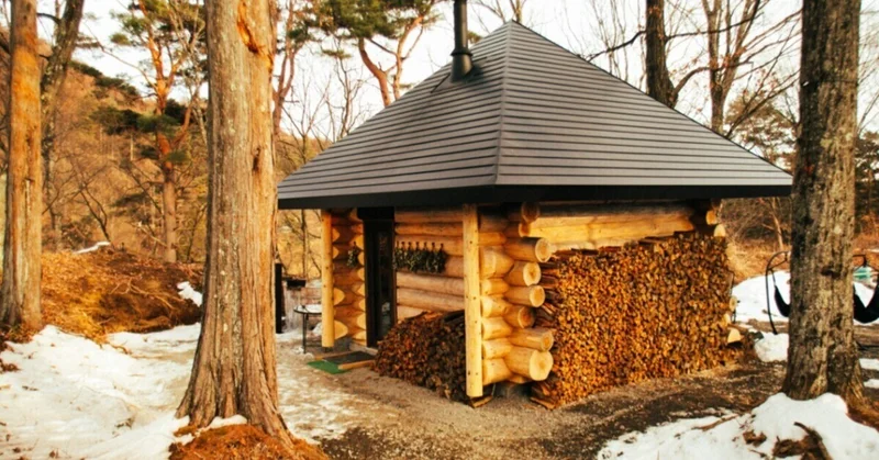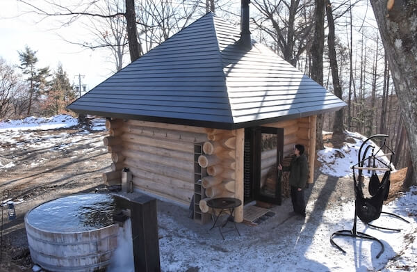 森の中をさらに進むとひっそりと佇むサウナ小屋が現れる。